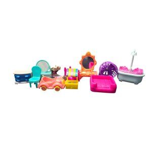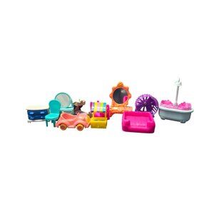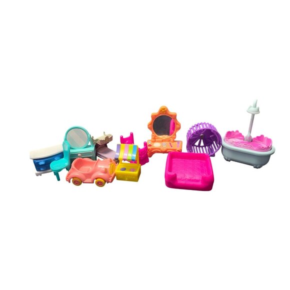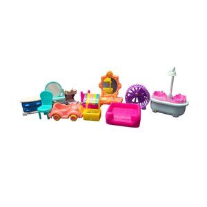 for smaller sized doll houses. Mixture of clothes and styles. They have been played with might have a few scuffs but over all still in good condition. Lot has a side dresser, Chair, Vanity, car, bed, stand, pet bed, bath tub and hamster wheel. Open to reasonable offers and bundle deals