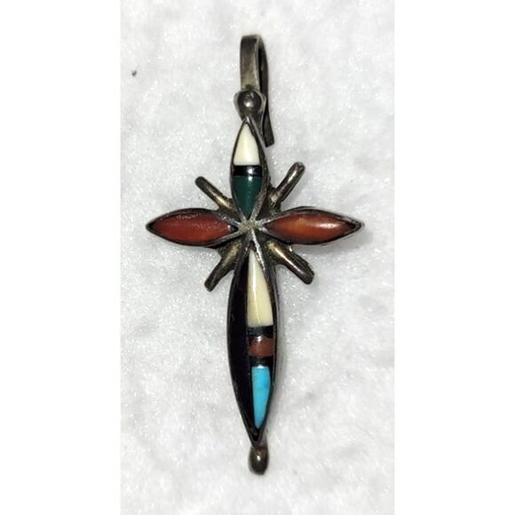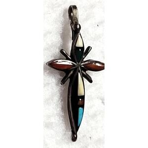 Sterling tested with acid. Signed with initials and Zuni hand signed can't make out the initials looks closest to AB but it is very rough. Old pawn style. Inlaid with different stones. The cross is approx 1" tall and 5/8" wide not including the hook.