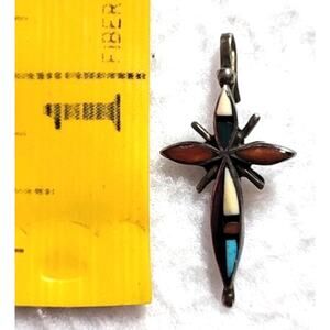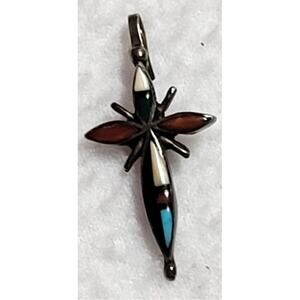 Antique Sterling Silver 925 Signed Initials Zuni Cross Pendant Intricate Inlay Gemstone. This is a small (almost tiny) Zuni pendant — please see photos with ruler for scale.