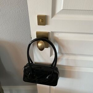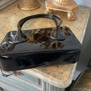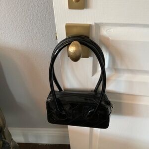 Small Steve Madden quilted black handbag. This is made of 100% polyester, but looks like patent leather. 9” wide, 5” tall, 2.5” deep, handles are 9” tall. Great out to dinner or to church bag.