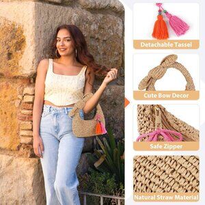 Features: Cute crescent shape made from natural handwoven straw, featuring removable tassels and bow decor for a fun, trendy vibe. Lightweight and convenient, ideal for carrying essentials like your phone, wallet, keys, and makeup. The soft fabric lining adds a touch of quality.