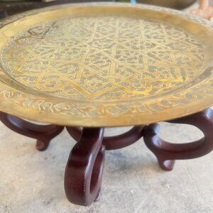 Small Table Top Vintage Boho Eclectic Decorative Carved Brass & Wood Stand / Tea