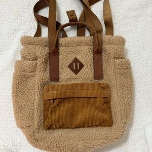 Cozy sherpa backpack with tan and brown accents. Features a front pocket and sturdy straps.