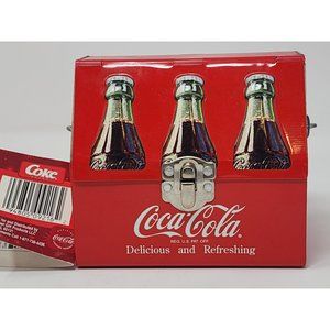 Small Tin Coca Cola LunchboxLunchPail Opens And Closes On Both Sides Wood Handle in good preowned condition still includes the tags. Would make a great addition to any collection. Measurements in pics. Comes as pictured.