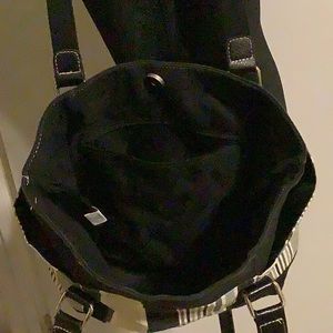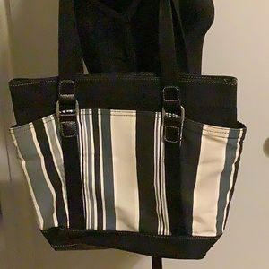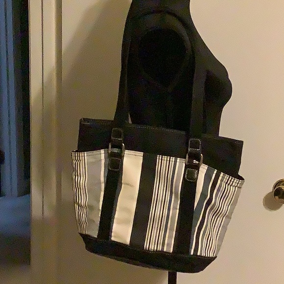 Grey, black, blue and white cloth tote. Bottom platform measuring 3 1/4 inches by 10 inches. Top to bottom 11.5 inches, 10 across, like the bottom. Large pocket with magnetic snap closure and zippered pocket inside. 2 pockets on outside that are a generous 7 inches deep. No stains inside or out. No brand on the item.