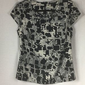 Black white gray patterned short sleeved Treo Jolie brand silky type top. Black and clear crystals on scoop neck collar. Very soft.