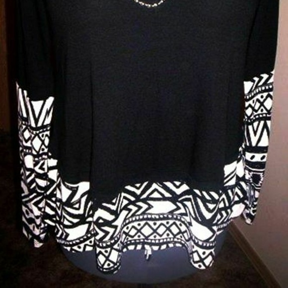 SMALL-NEW: Women Tribal Aztec Thumb Sleeve O'Neck Layer Look Overlay Top, Black