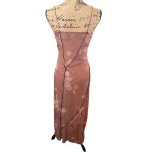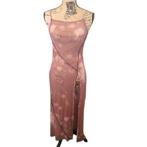 Small Urban Outfitters brown mesh floral maxi slip dress, very high thigh slit, inside out seams. It's probably best to wear layered with another slip dress or with a cute cami and leggings underneath like a tunic