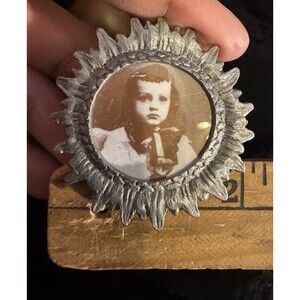 This is a vintage silver tone photo picture frame with an ornate filigree design. The frame is round and has a fancy mini size of 2 inches. It can hold one photo and is an original piece. The material of the frame is unknown.