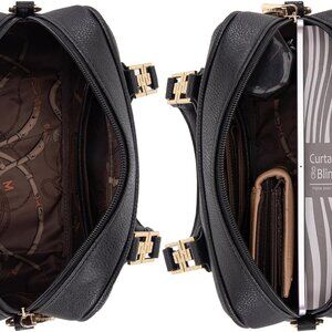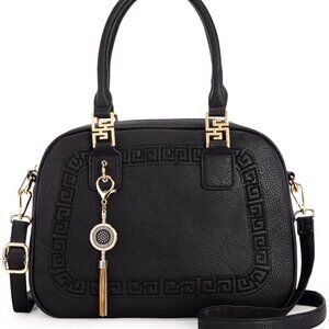 Features: Compact yet spacious enough for essentials, with a sleek barrel silhouette. Features a stylish tassel pendant, elegant pattern, and double S buckle details on the top handles. Includes a main zipper compartment, back zipper pocket, inside zipper pocket, and two slip pockets for organization. Comes with a 21" crossbody strap plus top handles for hand carry.