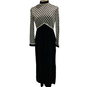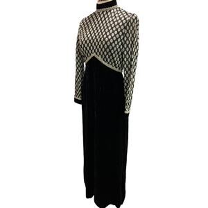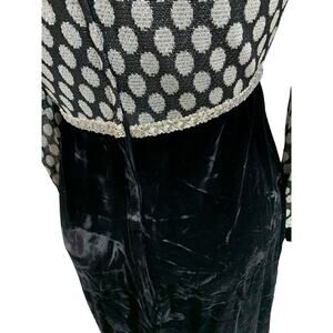 Small Vintage 1970s Black Velvet Metallic Dot Gown Long Fitted Bodice