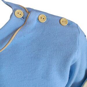 A charming piece from yesteryears, this Shades top boasts a pastel blue hue with cream accents and buttoned shoulder details, exuding nostalgic elegance.