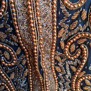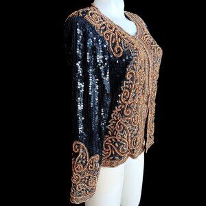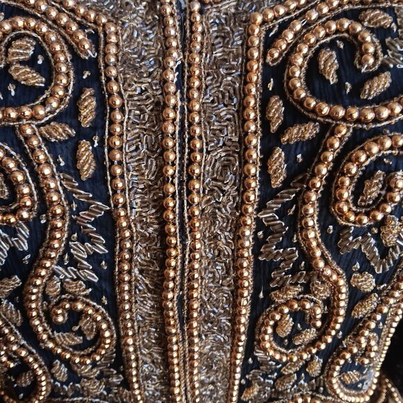 This exquisite vintage jacket features lavish black sequins and ornate gold beadwork, recalling the elegance of a bygone era. The intricate embroidery showcases a dedication to craftsmanship, making it a standout piece for collectors or those who appreciate timeless fashion.