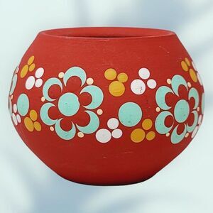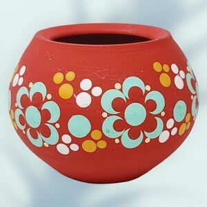 Add a touch of vintage elegance to your home decor with this beautiful small ceramic candle holder. The hand-painted flowers in red make it perfect for all occasions, whether it's a wedding or a holiday celebration. Its round shape and clay material give it a unique feel, while its size makes it suitable for taper candles.
