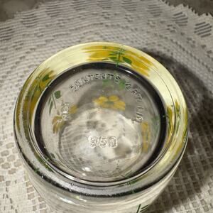 This small vintage flower glass old sour cream container is a charming piece from the 1970s. The unmarked highball glass features a lovely floral pattern in a vibrant yellow color. Made of glass, this 1/2 pint container is perfect for serving drinks or as a decorative piece in any home. Hand wash only to preserve its original beauty and vintage appeal.