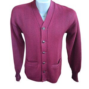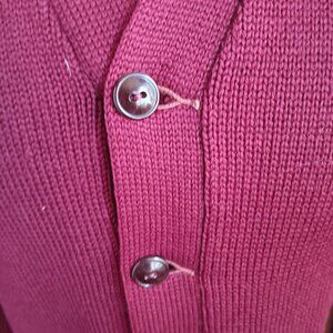 This vintage cardigan sweater brings an air of timeless elegance and classic style. Crafted from rich burgundy wool, it features a button-front closure and convenient front pockets. Perfectly suited for layering, it offers warmth and sophistication in equal measure. The sweater's luxurious texture and solid color make it a versatile addition to any wardrobe.
