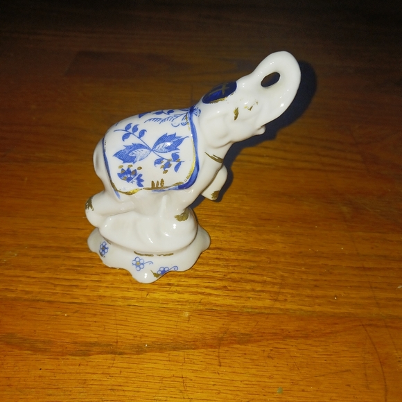 Small Vintage Porcelain Elephant Figurine with Blue Floral Design