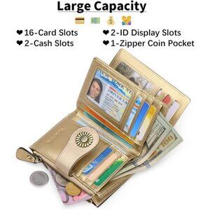 The small wallets for women come with 10x card slots, 6x short compartments, 2x ID windows, 2x cash slots, 1x zipper pocket, and plenty of storage to hold up your daily essentials