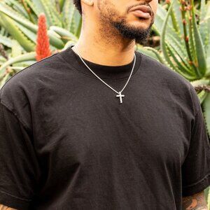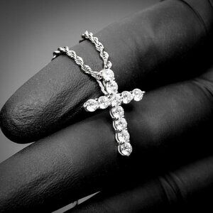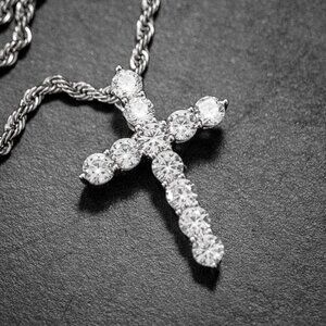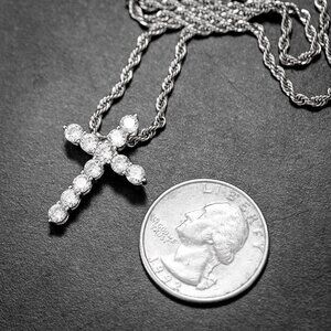 Small White Gold Plated Iced Cz Micro Cross Pendant And Rope Chain Necklace