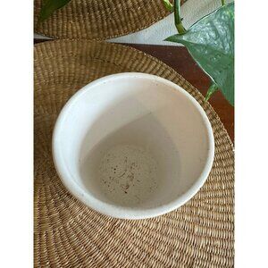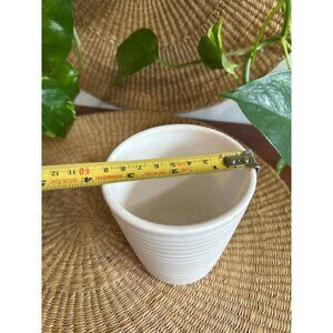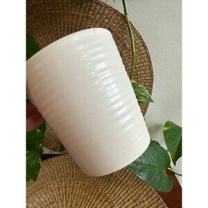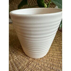 Simple and clean ceramic planter with a subtle ribbed texture and a minor chips on the rim. Measures approx. 4” tall and 3.5” wide. Great for small plants or tabletop decor.