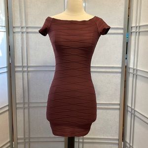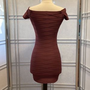 95% polyester and 5% spandex this form fitting dress in burgundy is a show stopper.