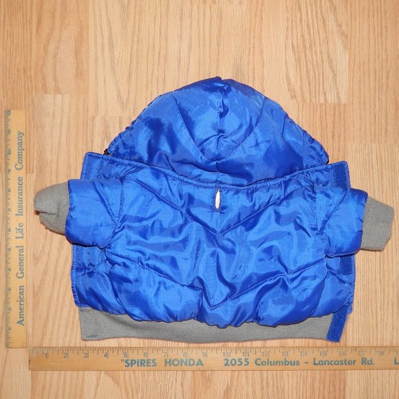 Small/toy breed winter jacket with hood. Blue body color with gray trim and a gray fleece lining.