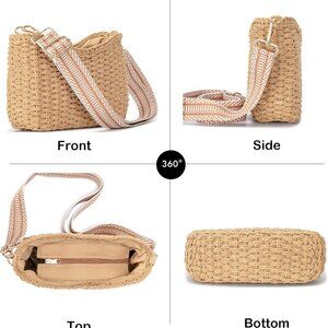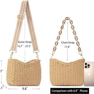 Features: Handwoven straw bag with a fun, versatile design. Comes with a colorful wide guitar strap and chain strap options, making it perfect as a crossbody, shoulder bag, or clutch. Roomy enough for your essentials like wallet, phone, sunglasses, and makeup. Zipper closure keeps everything secure.