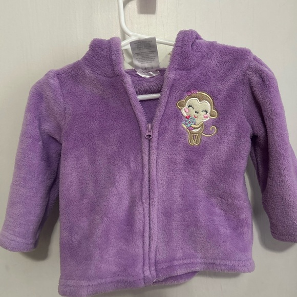 Charming lavender fleece jacket with playful monkey design. Ideal for keeping your baby warm.