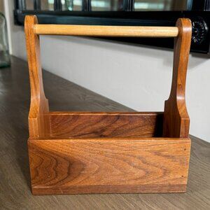 Small Wood Caddy Organizer • rustic tabletop storage • farmhouse decor • condiment / utensil / napkin holder • 8.0" L × 4.5" W × 8.5" H (with handle) • excellent condition