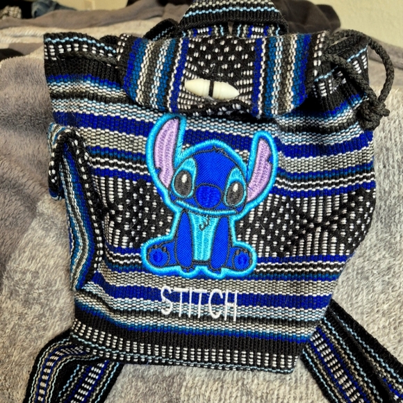 Small woven backpack, multi color. Stitch character on frount.