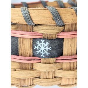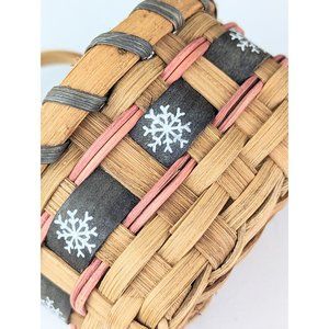 Adorable little vintage woven wood hanging basket measuring 4" wide and 4" tall. This small basket is skillfully woven and features pink and blue wood accents interwoven with lovely snowflakes painted on the blue wood. The basket is in pristine vintage condition with no defects noted. Perfect winter decor for a modern farmhouse. Cute gift idea.