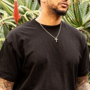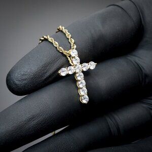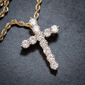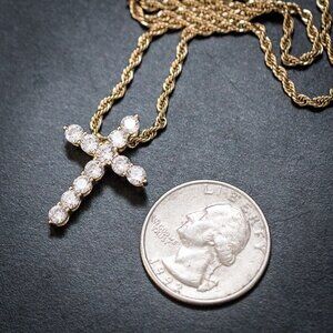 Small Yellow Gold Plated Iced Cz Micro Cross Pendant And Rope Chain Necklace