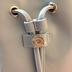 Super soft light grey, lined in red. Small inside zipper pouch. Eyeglasses are removable, can be used as a keychain. Handle and shoulder straps. Bucket stay bag, drawstring and magnetic closure. Measures approx 9 inches across the top and 12 inches high. Non smoking home.