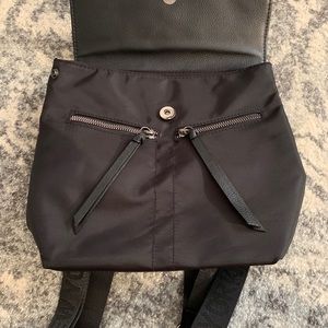 Botkier faux leather and nylon small backpack. It looks small, but surprisingly holds a lot. Two zip pockets on the outside and one on the inside. Adjustable straps. Super cute. I just didn’t need another black backpack. Offers welcome. From a smoke free home.