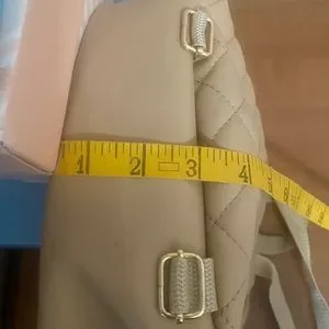 No name brand. Never used. Lighter tan color. See photos for measurements. Perfect size for those who carry minimal items. Convenient to stay in back and straps are very adjustable.