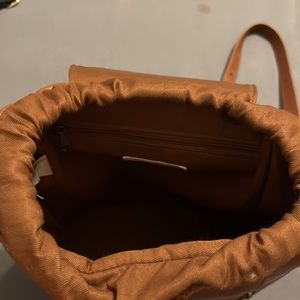 Tan colored backpack. Has draw string close and magnetic close. Good size for day trips. Good condition.
