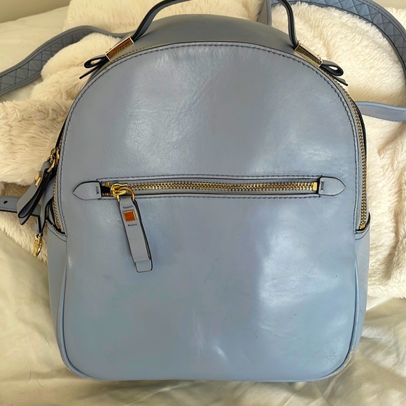 All leather backpack in zen blue by Cole Haan. Slight wear on bottom edge. Please see photo. Otherwise awesome condition. Bag approx. 9” wide x 10” long x 4” deep.
