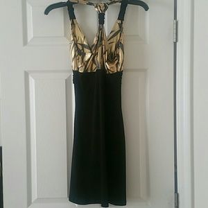 Super fun dress!! A fantastic go out on the town kind of dress. You will feel incredibly sexy. It is gold and black and super strappy. The dress flows at the bottom and it also has a plunging neckline. Small