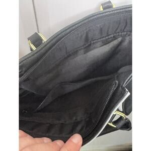 Small black with white stripes bag. Can be used with the handles or with the strap as a crossbody bag.