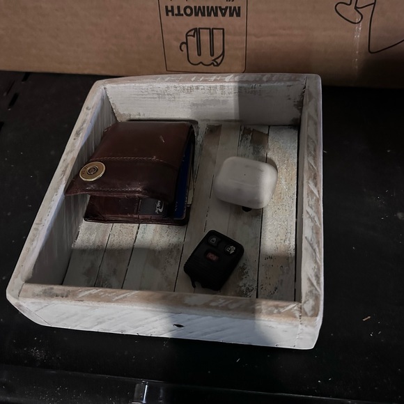 Rustic white wash patina box for keys, knickknacks pans, and or front entry, hallway, decor, table, top, anything you see fit wallet, and AirPods not included