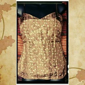 Cute brown background with colored rings & polka dots. Fully adjustable straps. Coontured fit with contrast velvet-like piping. Side zip. 100% silk.