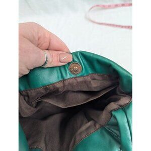 Small dak green plush tote bag with snap closure measures 9in x 9in x 3in O4