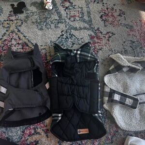3 vests for the price of one. One is reverseable. Green and black and white plaid. The grey one has reflective strips for dog walks. My Dog is about 6lbs.