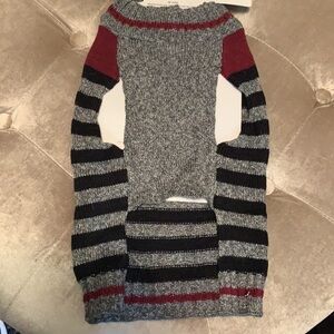 This is a brand new dog sweater in a size small that I thought was so cute but it’s too big for my toy fox terrier. It’s a really nice soft woven sweater in gray and black and burgundy and there’s a cute little pocket on the top. There is a slit, a little hole for the leash to go through and I like that it covers most of their underside so it keeps them warm. ❤️