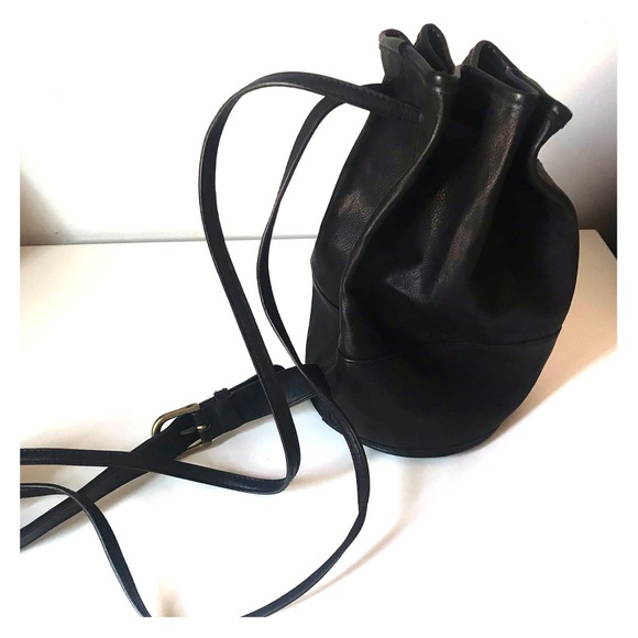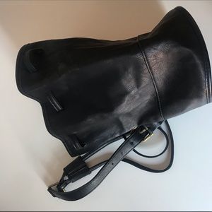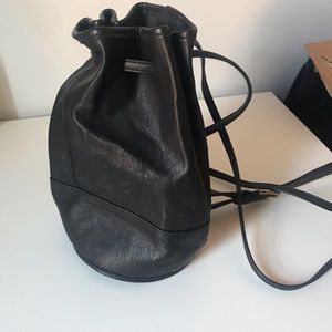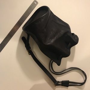 Black leather drawstring bag, single strap. Just under 12” tall, 5+” diameter.