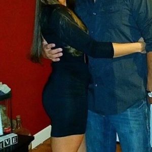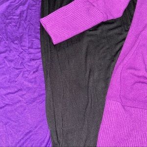 3 small bodycon mini dresses, very form fitting, the black and purple dress on the left are rayon/spandex and have 3/4 length sleeves, the purple dress with faux buttons on the right has ribbing at the wrists and at the bottom hem to keep it in place, material is more like a very thin sweater - camera flash allowed for tag to show through but it is not sheer in regular lighting! all dresses have only been worn once - size tags faded after being in the wash, colors best depicted in close up photo