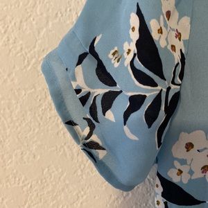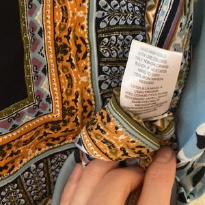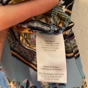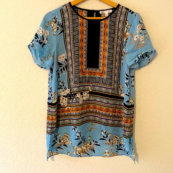 This is a DR to blouse size small from Nordstrom’s. It is tunic style with an elasticized bottom closure in the back. There is subtle pleating at the ends of the sleeves, and the tunic is slit on the sides, medevac being slightly longer