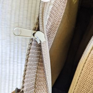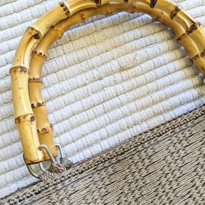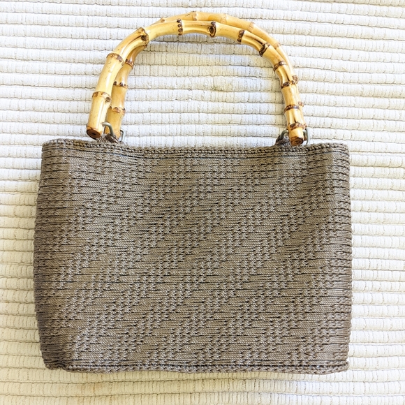 Small bamboo strap handbag. Woven nylon material. Excellent clean condition. Only flaw is zipper for closure is broken. Smoke free home. 9in x 7in x 3.5in