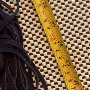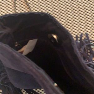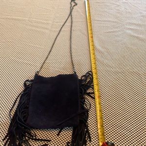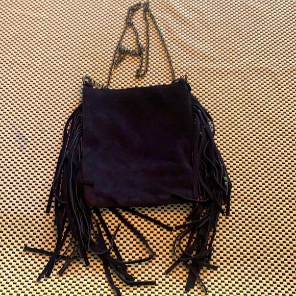 Leather suede fringed small handbag with bronze chain as strap. Magnet clasp. Never carried. 28” length (approx)