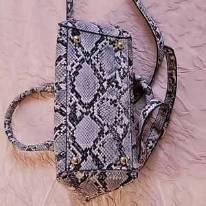 12" x 7" x 5" light pink and black snake print purse. double handle 6", zipper closure, removable crossbody strap 24", 1 zipper pocket outside, 1 zipper pocket inside, 2 slip pockets inside, fold hardware, removable pink change purse. It's adorable! Used once! I carry to much stuff for this purse, I thought I could downsize my bags and I just can't! 😆